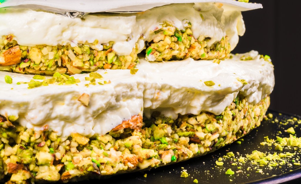 Eine Torte aus Pistazien-Mandel-Boden mit Quark-Sahne-Creme und Orangenschalen.