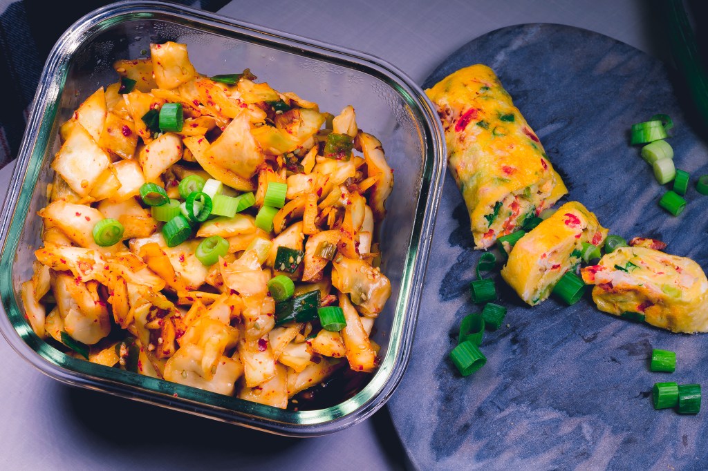 Das Kimchi ist nun schon servierfertig, wird aber besser, je länger es zieht.