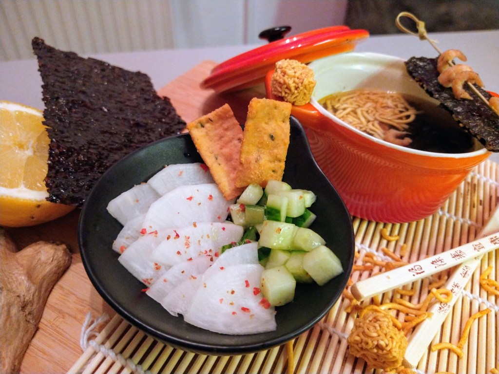 Ich habe das Seaweed nicht vom Salz befreit (ich hatte eingelegte Snacks von Kimmy, gibts bei Globus oder im Asia Shop 😉 ) und habe statt Gemüsebrühe Misobrühe verwendet, damit alles noch etwas „fischiger“ wird 🙂